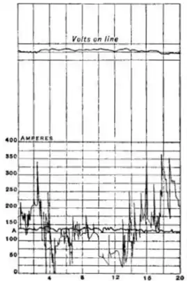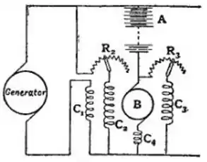 Fig. 21.Sometimes the number of cells is kept fixed for supply, but the p.d. they put on the mains is reduced during charge by employing regulating cells in opposition. Both these plans have proved unsatisfactory, and the battery is now preferably joined across the mains in parallel with the dynamo. The cells take the peaks of the load and thus relieve the dynamo and engine of sudden changes, as shown in fig. 21. Here the line current (shown by the erratic curve) varied spasmodically from 0 to 375 amperes, yet the dynamo current varied from 100 to 150 amperes only (see line A). At the same time the line voltage (535 volts normal) was kept nearly constant. In the late evening the cells became exhausted and the dynamo charged them. Extra voltage was required at the end of a “charge” and was provided by a “booster.” Originally a booster was an auxiliary dynamo worked in series with the chief machine, and driven in any convenient way. It has developed into a machine with two or more exciting coils, and having its armature in series with the cells (see fig. 22). The exciting coils act in opposition; the one carrying the main current sets up an e.m.f. in the same direction as that of the cells, and helps the cells to discharge as the load rises. When the load is small, the voltage on the mains is highest and the shunt exciting current greatest. The booster e.m.f. now acts with the dynamo and against the cells, and causes them to take a full charge. Even this arrangement did not suffice to keep the line voltage as constant as seemed desirable in some cases, as where lighting and traction work were put on the same plant. Fig. 23 is a diagram of a complex booster which gives very good regulation. The booster B has its armature in series with the accumulators A, and is kept running in a given direction at a constant speed by means of a shunt-wound motor (not shown), so that the e.m.f. induced in the armature depends on the excitation. This is made to vary in value and in direction by means of four independent enciting coils, C1, C2, C3, C4. The last is not essential, as it merely compensates for the small voltage drop in the armature. It is obvious that the excitation C3 will be proportionate to the difference in voltage between the battery and the mains, and it is arranged that battery volts and booster volts shall equal the volts on the mains. Under this excitation there is no tendency for the battery to charge or discharge. But any additional excitation leads to strong currents one way or the other. Excitation C1 rises with the load on the line, and gives an e.m.f. helping the battery to discharge most when the load is greatest. C2 is dependent on the bus-bar voltage, and is greatest when the generator load is small: it opposes C1 and therefore excites the booster to charge the battery. The exact generator load at which the booster shall reverse its e.m.f. from a charging to a discharging value is adjusted by the resistance R2 in series with C2. A similar resistance R6 allows the excitation of C3 to be adjusted. Very remarkable regulation can be obtained by reversible boosters of this type. In traction and lighting stations it is quite possible to keep the variation of bus-bar pressure within 2% of the normal value, although the load may momentarily vary from a few amperes up to 200 or 300.