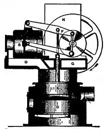(D) with the working cylinder (B). The displacer (E), which takes its motion through a rod (I) from a rocking lever (F) connected by a short link to the crank-pin, is itself the regenerator, its construction being such that the air passes up and down through it as in one of the original Stirling forms. The cooler is a water vessel (G) through which water circulates from a tank (H). Messrs. Hayward and Tyler’s “Rider” engine may be mentioned as another small hot-air motor which follows nearly the Stirling cycle of operations.