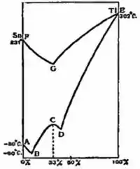 Fig. 7 of iron and molybdenum and many other substances, have also been isolated in this way. The freezing-point curve sometimes indicates the existence of chemical compounds. The simple type of curve, such as that of lead and tin, fig. 6, consisting of two downward sloping branches meeting in the eutectic point, and that of thallium and tin, the upper curve of fig. 7, certainly give no indication of chemical combination. But the curves are not always so simple as the above. The lower curve of fig. 7 gives the freezing-point curve of mercury and thallium; here A and E are the melting-points of pure mercury and pure thallium, and the branches AB and ED do not cut each other, but cut an intermediate rounded branch BCD. There are thus two eutectic alloys B and D, and the alloys with compositions between B and D have higher melting-points. The summit C of the branch BCD occurs at a percentage exactly corresponding to the formula Hg2Tl. It is probable that all the alloys of compositions between B and D, when they begin to solidify, deposit crystals of the compound; the lower eutectic B probably corresponds to a solid complex of mercury and the compound. The point B is at −60° C., the lowest temperature at which any metallic substance is known to exist in the liquid state. The higher eutectic D may correspond to a complex of solid thallium and the compound; but the possible existence of solid solutions makes further investigation necessary here. The curves of fig. 7 were determined by N. S. Kurnakow and N. A. Puschin. Sometimes a freezing-point curve contains more than one intermediate summit, so that more than one compound is indicated. For example, in the curve for gold-aluminium, ignoring minor singularities, we find two intermediate summits, one at the percentage Au2Al, and another at the percentage AuAl2. Microscopic examination fully confirms the existence of these compounds. The substance AuAl2 is the most remarkable compound of two metals that has so far been discovered; although it contains so much aluminium its melting-point is as high as that of gold. It also possesses a splendid purple