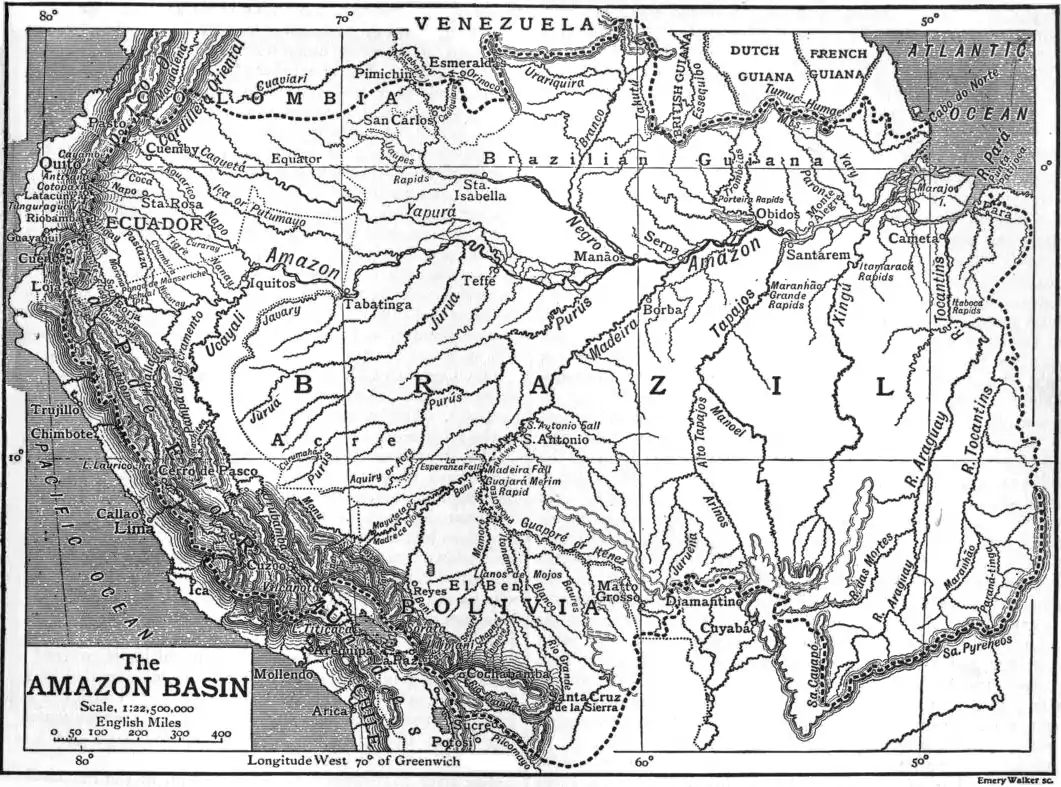 The waters find their way to the falls of the Madeira by many great rivers, the principal of which, if we enumerate them from east to west, are the Guaporé or Itenez, the Baures and Blanco, the Itonama or San Miguel, the Mamoré, Beni, and Mayutata or Madre de Dios, all of which are reinforced by numerous secondary but powerful affluents. The Guaporé presents many difficulties to continuous navigation; the Baures and Itonama offer hundreds of miles of navigable waters through beautiful plains; the Mamoré has been sounded by the writer in the driest month of the year for a distance of 500 m. above Guajará-Merim, who found never less than from 10 to 30 ft. of water, with a current of from 1 to 3 m. an hour. Its Rio Grande branch, explored under the writer’s instructions, was found navigable for craft drawing 3 ft. of water to within 30 m. of Santa Cruz de la Sierra—a level sandy plain intervening. The Grande is a river of enormous length, rising in a great valley of the Andes between the important cities of Sucre and Cochabamba, and having its upper waters in close touch with those of the Pilcomayo branch of the river Paraguay. It makes a long curve through the mountains, and, after a course of about 800 m., joins the Mamoré near 15° S. lat. The Chaparé, Securé and Chimoré, tributaries of the Mamoré, are navigable for launches up to the base of the mountains, to within 130 m. of Cochabamba. The Beni has a 12-ft. fall 18 m. above its mouth called “La Esperanza”; beyond this, it is navigable for 217 m. to the port of Reyes for launches in the dry season and larger craft in the wet one. The extreme source of the Beni is the little river La Paz, which rises in the inter-Andean region, a few miles south-east of Lake Titicaca, and flows as a rivulet through the Bolivian city of La Paz. From this point to Reyes the river is a torrent. The principal affluent of the Beni, and one which exceeds it in volume, enters it 120 m. above its mouth, and is known to the Indians along its banks as the Mayutata, but the Peruvians call it the Madre de Dios. Its ramifications drain the slopes of the Andes between 12° and 15° of latitude. It is navigable in the wet season to within 180 m, of Cuzco. Its upper waters are separated by only a short transitable canoe portage of 7 m. in a straight line from those of the Ucayali. The portage on the eastern side terminates at the Cashpajali river 22 m. above its junction with the Manu. For the first 13 m. it is navigable all the year for craft drawing 18 in. of water, but the remaining 9 m. present many obstacles to navigation. At the Manu junction the elevation above sea-level is 1070 ft., the river width 300 ft., depth 8 ft., current 114 m. per hour. The general direction of the Manu is south-east for 158 m. as far as the Pilcopata river, where under the name of Madre de Dios it continues with a flow of 22,000 cubic metres per minute. Here its elevation is 718 ft. above the sea and its width 500 ft. During the above course of 158 m. the Manu receives 135 large and small affluents. Although the inclination of its bed is not great, the obstacles to free navigation are abundant, and consist of enormous trees and masses of tree-trunks which have filled the river during the period of freshets.
