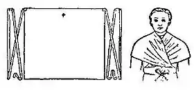 Fig. 1.—Amice of the Present Day.it is called the humerale (from humerus, shoulder). According to modern Roman use, laid down by the decree of the Congregation of Rites in 1819, the amice must be of linen or of a hempen material, not wool; and, as directed by the new Roman Missal (1570), a small cross must be sewn or embroidered in the middle of it. In putting it on it is first laid on the head, then allowed to fall on the shoulders, and finally folded round the chest and tied with the strings attached for that purpose (see fig. 1).