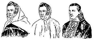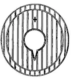 Fig. 3.—The Papal Fanone.In the 9th century it spread to the other countries that adopted the Roman use: it is mentioned in an inventory of vestments given by Abbot Angilbert (d. 814) to the monastery at Centula (St Riguier) and in the de clericorum institutione of Hrabanus Maurus (c. 820). The amice was worn first simply as a shoulder-cloth, but at the end of the 9th century the custom grew up of putting it on over the head and of wearing it as a hood, either while the other vestments were being put on or, according to the various uses of local churches, during part of the Mass, though never during the canon. This ceased at Rome at the same time as the apparel disappeared; but two relics of it survive—(1) in the directions of the Missal for putting on the amice, (2) in the ordination of subdeacons, when the bishop lays the vestment on the ordinand's head with the words, “Take the amice, which symbolizes discipline over the tongue, &c.” The priest too in putting it on prays, “Place on my head the helmet of salvation, &c.”