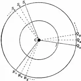 If we make a more accurate computation of the conjunctions from these data, we shall find that, in the general mean, the consecutive conjunctions take place when each planet has moved through an entire number of revolutions + 242·7°. It follows that the third conjunction instead of occurring exactly along the line CQ1 occurs along CQ2, making an angle of nearly 8° with CQ1. The successive conjunctions following will be along CR2, CS2, CQ3, &c., the law of progression being obvious.