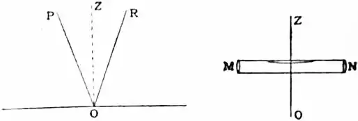 In the first system of co-ordinates already described the fundamental axis is the vertical line or direction of gravity at the point of observation. This is not the direction of gravity proper, or of the earth’s attraction, but the resultant of this attraction combined with the centrifugal force due to the earth’s rotation on its axis. The most obvious method of realizing this direction is by the plumb-line. In our time, however, this appliance is replaced by either of two others, which admit of much more precise application. These are the basin of mercury and the spirit-level. The surface of a liquid at rest is necessarily perpendicular to the direction of gravity, and therefore horizontal. Considered as a curved surface, concentric with the earth, a tangent plane to such a surface is the plane of the horizon. The problem of measuring from an axis perpendicular to this plane is solved on the principle that the incident and reflected rays of light make equal angles with the perpendicular to a reflecting surface. It follows that if PO (fig. 5) is the direction of a ray, either from a heavenly body or from a terrestrial point, impinging at O upon the surface of quicksilver, and reflected in the direction OR, the vertical line is the bisector OZ, of the angle POR. If the point P is so adjusted over the quicksilver that the ray is reflected back on its own path, P and R lying on the same line above O, then we know that the line PO is truly vertical. The zenith-distance of an object is the angle which the ray of light from it makes with the vertical direction thus defined.