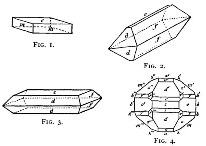 Crystals of barytes are orthorhombic and isomorphous with the strontium and lead sulphates (celestite and anglesite); they are usually very perfectly developed and present great variety of form. The simplest are rhomb-shaped tables (fig. 1) bounded by the two faces of the basal pinacoid (c) and the four faces of the prism (m); the angle between the prism-faces (mm) is 78° 23′, whilst that between c and m is 90°. The mineral has a very perfect cleavage parallel to the faces c and m, and the cleavage surfaces are perfectly smooth and bright. The crystals of prismatic habit represented in figs. 2 and 3 are bounded by the domes d and f and the basal pinacoid c; fig. 4 is a plan of a still more complex crystal. Twinning is represented only by twin-lamellae, which are parallel to the planes m and f and are of secondary origin, having been produced by pressure.