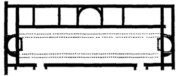 The interior consisted of a long and wide nave, sometimes as much as 80 ft. across, terminating in a semicircular apse, with one or sometimes (St Paul’s, Old St Peter’s, St John Lateran) two aisles on each side, separated by colonnades of marble pillars supporting horizontal entablatures (Old St Peter’s, S. Maria Maggiore, S. Lorenzo) or arches (St Paul’s, S. Agnese, S. Clemente, the two basilicas of S. Apollinare at Ravenna). Above the pillars the clerestory wall rose to a great height, pierced in its upper part by a range of plain round-headed windows. The space between the windows and the colonnade (the later triforium-space) was usually decorated with a series of mosaic pictures in panels. The colonnades sometimes extended quite to the end of the church (the Ravenna basilicas), sometimes ceased some little distance from the end, thus admitting the formation of a transverse aisle or transept (St Paul’s, Old St Peter’s, St John Lateran). Where this transept occurred it was divided from the nave by a wide arch, the face and soffit of which were richly decorated with mosaics. Over the crown of the arch we often find a bust of Christ or the holy lamb lying upon the altar, and, on either side, the evangelistic symbols, the seven candlesticks and the twenty-four elders. Another arch spanned the semicircular apse, in which the church always terminated. From Carolingian times this was designated the arch of triumph, because a cross was suspended from it.