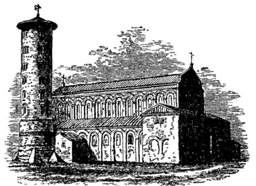 The exterior of the basilicas was usually of an extreme plainness. The vast brick walls were unrelieved by ornament, save occasionally by arcading as at S. Apollinare in Classe, Ravenna, and had no compensating grace of outline or beauty of proportion. An exception was made for the entrance front, which was sometimes covered with plates of marble mosaics or painted stucco (Old St Peter’s, S. Lorenzo). But in spite of any decorations the external effect of a basilica must always have been heavy and unattractive. S. Apollinare in Classe at Ravenna (fig. 8) affords a typical