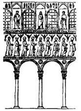 Constantinople preserved till recently a basilican church of the 5th century, that of St John Studios, 463, now a ruin. It had a nave and side aisles divided by columns supporting a horizontal entablature, with another order supporting arches forming a gallery above. There was the usual apsidal termination. The chief difference between the Eastern and Roman basilicas is in the galleries. This feature is very rare in the West, and only occurs in some few examples, the antiquity of which is questioned at Rome but never at Ravenna. It is, on the other hand, a characteristic feature of Eastern churches, the galleries being intended for women, for whom privacy was more studied than in the West (Salzenberg, Altchrist. Baudenkmale von Constantinople).