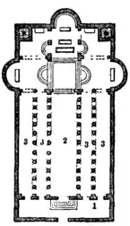 | Fig. 20.—Plan of church of the Nativity, Bethlehem. 1, Narthex; 2, nave; 3, 3, aisles. |