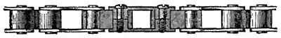 Roller chains for cycles are made in two pitches, 12 in. and 58 in., and in widths from 18 in. to 14 in. between the side plates of the inside links. The weight of 4 ft. length (96 links) of a 12 in. pitch 18 in. wide roller chain is about 1214 oz., and its breaking load is about 2000 ℔ In a block chain the ends of the blocks engage with the teeth of the chain-wheels, and the same surfaces continually coming into contact, the wear may become excessive, especially when exposed to mud and grit. In the roller chain the outer surfaces of the rollers engage with the teeth of the chain-wheels, and during the engagement and disengagement may roll slightly on the tubular rivets. The surface of contact of the roller and tubular rivet is not directly exposed to the dust and grit from the road. The rollers therefore serve the double purpose of (1) transferring the relative motion of the parts to a pair of surfaces under better conditions as regards lubrication, and (2) presenting a new part of the outside surface of the roller for the next engagement with the chain-wheel. The durability of roller chains is thus much greater than that of block chains, under the usual conditions of cycling.