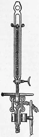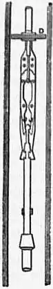 The chief point of difference from rod-boring is the substitution of rope for the jointed rods. For deep boring it possesses the advantage of saving the large amount of time consumed in raising and lowering the rods, as required whenever the hole is to be cleaned out, or a dull bit replaced, since the tools are rapidly run up or down by means of the rope with which they are operated while drilling. The speed of rope-boring is therefore but little affected by increase of depth, while with rod-boring it falls off rapidly. In its simplest form the so-called “string of tools,” suspended from the rope, is composed of the bit or drill, jars and rope-socket. The jars are a pair of sliding links, similar to those used for rod-boring, but serving a different purpose, viz. to produce a sharp shock on the upward stroke, as the jars come together, for loosening the bit should it tend to stick fast in the hole. A heavy bar (auger stem) is generally inserted between the jars and bit, for increasing the force of the blow. The weight of another bar above the jars (sinker-bar) keeps the rope taut. The length of stroke and feed are regulated by the “temper-screw” (fig. 7), a feed device resembling that used for rod-boring. Clamped to it is the drill rope, which is let out at intervals, as the hole is deepened. The bits usually range from 3 to 8 in. diameter, the speed of boring being generally between 20 and 40 ft. per 24 hours, according to the kind of rock. A great variety of special “fishing tools” are made, for use in case of breakage of parts in the hole or other accident.