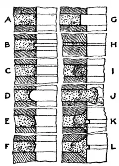 Fig. 3.—Forms of Joints. The pointing of a wall, as previously mentioned, is done either with the bricklaying or at the completion of the work. If the pointing is to be of the same mortar as the rest of the work, it would probably greatly facilitate matters to finish off the work at one operation with the bricklaying, but where, as in Pointing.many cases, the pointing is required to be executed in a more durable mortar, this would be done as the scaffold is taken down at the completion of the building, the joints being raked out by the bricklayer to a depth of 12 or 34 in. By the latter method the whole face of the work is kept uniform in appearance. The different forms of joints in general use are clearly shown in fig. 3. Flat or flush joints (A) are formed by pressing the protruding mortar back flush with the face of the brickwork. This joint is commonly used for walls intended to be coated with distemper or limewhite. The flat joint jointed (two forms, B and C) is a development of the flush joint. In order to increase the density and thereby enhance the durability of the mortar, a semicircular groove is formed along the centre, or one on each side of the joint, with an iron jointer and straight-edge. Another form, rarely used, is the keyed joint shown at D, the whole width of the joint in this case being treated with the curved key. Struck or bevelled, or weathered, joints have the upper portion pressed back with the trowel to form a sloping surface, which throws off the wet. The lower edge is cut off with the trowel to a straight edge. This joint is in very common use for new work. Ignorant workmen frequently make the slope in the opposite direction (F), thus forming a ledge on the brick; this catches the water, which on being frozen rapidly causes the disintegration of the upper portion of the brick and of the joint itself. With recessed jointing, not much used, a deep shadow may be obtained. This form of joint, illustrated in G, is open to very serious objections, for it encourages the soaking of the brick with rain instead of throwing off the wet, as it seems the natural function of good pointing, and this, besides causing undue dampness in the wall, renders it liable to damage by frost. It also leaves the arrises of the bricks unprotected and liable to be damaged, and from its deep recessed form does not make for stability in the work. Gauged work has very thin joints, as shown at H, formed by dipping the side of the brick in white lime putty. The sketch I shows a joint raked out and filled in with pointing mortar to form a flush joint, or it may be finished in any of the preceding forms. Where the wall is to be plastered the joints are either left open or raked out, or the superfluous mortar may be left protruding as shown at J. By either method an excellent key is obtained, to which the rendering firmly adheres. In tuck pointing (K) the joints are raked out and stopped, i.e. filled in flush with mortar coloured to match the brickwork. The face of the wall is then rubbed over with a soft brick of the same colour, or the work may be coloured with pigment. A narrow groove is then cut in the joints, and the mortar allowed to set. White lime putty is next filled into the groove, being pressed on with a jointing tool, leaving a white joint 18 to 14 in. wide, and with a projection of about 116 in. beyond the face of the work. This method is not a good or a durable one, and should only be adopted in old work when the edges of the bricks are broken or irregular. In bastard tuck pointing (L), the ridge, instead of being in white lime putty, is formed of the stopping mortar itself.