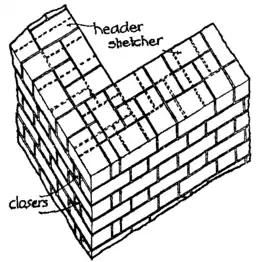 In stretching bond, which should only be used for walls half a brick in thickness, all the bricks are laid as stretchers, a half brick being used in alternate courses to start the bond. In work curved too sharply on plan to admit of the use of stretchers, and for footings, projecting mouldings and corbels, the bricks are all laid as headers, i.e. with their ends to the front, and their length across the thickness of the wall. This is termed “heading bond.”
