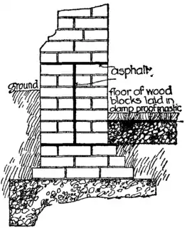 Walls are liable to become damp, (1) by wet rising up the wall from the earth; (2) by water soaking down from the top of the wall; (3) by rain being driven on to the face by wind. Dampness from the first cause may be prevented by the introduction of damp-proof courses or the constructionPrevention