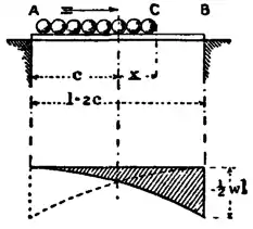 23. Shear due to Travelling Loads.—Let a uniform train weighing w per ft. run advance over a girder of span 2c, from the left abutment. When it covers the girder to a distance x from the centre (fig. 41) the total load is w(c+x); the reaction at B is