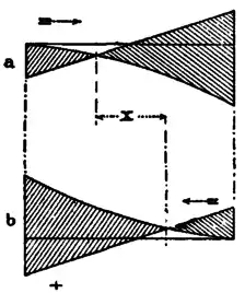 24. Counterbracing.—In the case of girders with braced webs, the tension bars of which are not adapted to resist a thrust, another circumstance due to the position of the live load must be considered. For a train advancing from the left, the travelling load shear in the left half of the span is of a different sign from that due to the dead load. Fig. 43 shows the maximum shear at vertical sections due to a dead and travelling load, the latter advancing (fig. 43, a) from the left and (fig. 43, b) from the right abutment. Comparing the figures it will be seen that over a distance x near the middle of the girder the shear changes sign, according as the load advances from the left or the right. The bracing bars, therefore, for this part of the girder must be adapted to resist either tension or thrust. Further, the range of stress to which they are subjected is the sum of the stresses due to the load advancing from the left or the right.
