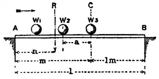 26. Greatest Bending Moment due to travelling concentrated Loads.—For the greatest bending moment due to a travelling live load, let a load of w per ft. run advance from the left abutment (fig. 47), and let its centre be at x from the left abutment. The reaction at B is 2wx2/l and the bending moment at any section C, at m from the left abutment, is 2wx2/(l−m)/l, which increases as x increases till the span is covered. Hence, for uniform travelling loads, the bending moments are greatest when the loading is complete. In that case the loads on either side of C are proportional to m and l-m. In the case of a series of travelling loads at fixed distances apart passing over the girder from the left, let W1, W2 (fig. 48), at distances x and x+a from the left abutment, be their resultants on either side of C. Then the reaction at B is W1x/l+W2(x+a)/l. The bending moment at C is