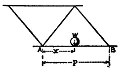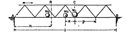 25. Greatest Shear when concentrated Loads travel over the Bridge.—To find the greatest shear with a set of concentrated loads at fixed distances, let the loads advance from the left abutment, and let C be the section at which the shear is required (fig. 44). The greatest shear at C may occur with W1 at C. If W1 passes beyond C, the shear at C will probably be greatest when W2 is at C. Let R be the resultant of the loads on the bridge when W1 is at C. Then the reaction at B and shear at C is Rn/l. Next let the loads advance a distance a so that W2 comes to C. Then the shear at C is R(n+a)/l−W1, plus any reaction d at B, due to any additional load which has come on the girder during the movement. The shear will therefore be increased by bringing W2 to C, if Ra/l+d > W1 and d is generally small and negligible. This result is modified if the action of the load near the section is distributed to the bracing intersections by rail and cross girders. In fig. 45 the action of W is distributed to A and B by the flooring. Then the loads at A and B are W(p−x)/p and Wx/p. Now let C (fig. 46) be the section at which the greatest shear is required, and let the loads advance from the left till W1 is at C. If R is the resultant of the loads then on the girder, the reaction at B and shear at C is Rn/l. But the shear may be greater when W2 is at C. In that case the shear at C becomes R(n+a)/l+d−W1, if a > p, and R(n+a)/l+d−W1a/p, if a < p. If we neglect d, then the shear increases by moving W2 to C, if Ra/l > W1 in the first case, and if Ra/l > W1a/p in the second case.