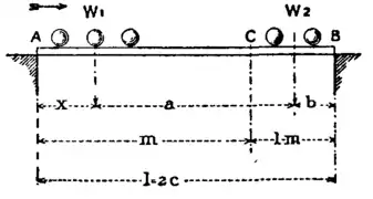 and this is positive or the bending moment increases, if W1(l−m) > W2m, or if W1/m > W2/(l−m). But these are the average loads per ft. run to the left and right of C. Hence, if the average load to the left of a section is greater than that to the right, the bending moment at the section will be increased by moving the loads to the right, and vice versa. Hence the maximum bending moment at C for a series of travelling loads will occur when the average load is the same on either side of C. If one of the loads is at C, spread over a very small distance in the neighbourhood of C, then a very small displacement of the loads will permit the fulfilment of the condition. Hence the criterion for the position of the loads which makes the moment at C greatest is this: one load must be at C, and the other loads must be distributed, so that the average loads per ft. on either side of C (the load at C being neglected) are nearly equal. If the loads are very unequal in magnitude or distance this condition may be satisfied for more than one position of the loads, but it is not difficult to ascertain which position gives the maximum moment. Generally one of the largest of the loads must be at C with as many others to right and left as is consistent with that condition.