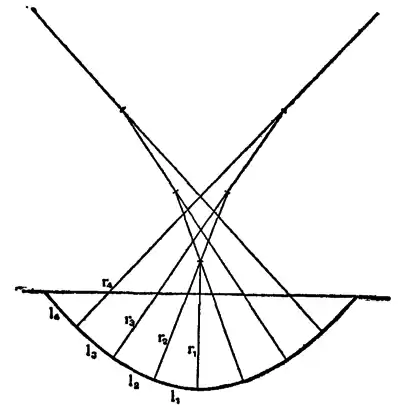 as shown in fig. 72 with arcs of the length l1, l2, l3, &c., and with the radii r1, r2, &c. (note, for a length 12l1 at each end the radius will be infinite, and the curve must end with a straight line tangent to the last arc), then let v be the measured deflection of this curve from the straight line, and V the actual deflection of the bridge; we have V = av/b, approximately. This method distorts the curve, so that vertical ordinates of the curve are drawn to a scale b times greater than that of the horizontal ordinates. Thus if the horizontal scale be one-tenth of an inch to the foot, a = 120, and a beam 100 ft. in length would be drawn equal to 10 in.; then if the true radius at the centre were 10,000 ft., this radius, if the curve were undistorted, would be on paper 1000 in., but making b = 50 we can draw the curve with a radius of 20 in. The vertical distortion of the curve must not be so great that there is a very sensible difference between the length of the arc and its chord. This can be regulated by altering the value of b. In fig. 72 distortion is carried too far; this figure is merely used as an illustration.