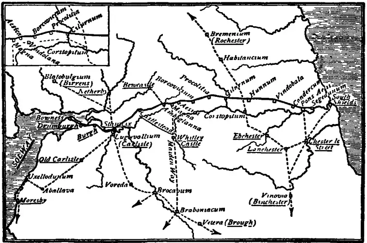 the interior was held by a system of roads and forts not yet well understood but discernible at such points as Caer-gai on Bala Lake, Castle Collen near Llandrindod Wells, the Gaer near Brecon, Merthyr and Gellygaer. In the north of Britain we find three principal roads. One led due north from York past forts at Catterick Bridge, Piers Bridge, Binchester, Lanchester, Ebchester to the wall and to Scotland, while branches through Chester-le-Street reached the Tyne Bridge (Pons Aelius) at Newcastle and the Tyne mouth at South Shields. A second road, turning north-west from Catterick Bridge, mounted the Pennine Chain by way of forts at Rokeby, Bowes and Brough-under-Stainmoor, descended into the Eden valley, reached Hadrian’s wall near Carlisle (Luguvallium), and passed on to Birrens. The third route, starting from Chester and passing up the western coast, is more complex, and exists in duplicate, the result perhaps of two different schemes of road-making. Forts in plenty can be detected along it, notably Manchester (Mancunium or Mamucium), Ribchester (Bremetennacum), Brougham Castle (Brocavum), Old Penrith (Voreda), and on a western branch, Watercrook near Kendal, Waterhead near the hotel of that name on Ambleside, Hardknott above Eskdale, Maryport (Uxellodūnum), and Old Carlisle (possibly Petriana). In addition, two or three cross roads, not yet sufficiently explored, maintained communication between the troops in Yorkshire and those in Cheshire and Lancashire. This road system bears plain marks of having been made at different times, and with different objectives, but we have no evidence that any one part was abandoned when any other was built. There are signs, however, that various forts were dismantled as the country grew quieter. Thus, Gellygaer in South Wales and Hardknott in Cumberland have yielded nothing later than the opening of the 2nd century.