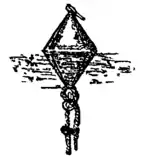 built of steel, with bulkheads to lessen the risk of their sinking by collision, and, with the exception of bell buoys, do not contain water ballast. In 1878 gas buoys, with fixed and occulting lights of 10-candle power, were introduced. In 1896 Mr T. Matthews, engineer-in-chief in the London Trinity Corporation, developed the present design (fig. 12). It is of steel, the lower plates being 58 in. and the upper 716 in. in thickness, thus adding to the stability. The buoy holds 380 cub. ft. of gas, and exhibits an occulting light for 2533 hours. This light is placed 10 ft. above the sea, and, with an intensity of 50 candles, is visible 8 m. It occults every ten seconds, and there is seven seconds’ visibility, with three seconds’ obscuration. The occultations are actuated by a double valve arrangement. In the body of the apparatus there is a gas chamber having sufficient capacity, in the case of an occulting light, for maintaining the flame in action for seven seconds, and by means of a by-pass a jet remains alight in the centre of the burner. During the period of three seconds’ darkness the gas chamber is re-charged, and at the end of that period is again opened to the main burner by a tripping arrangement of the valve, and remains in action seven seconds. The gas chamber of the buoy, charged to five atmospheres, is replenished from a steamer fitted with a pump and transport receivers carrying indicating valves, the receivers being charged to ten atmospheres. Practically no inconvenience has resulted from saline or other deposits, the glazing (glass) of the lantern being thoroughly cleaned when re-charging the buoy. Acetylene, generated from calcium carbide inside the buoy, is also used. Electric light is exhibited from some buoys in the United States. In England an automatic electric buoy has been suggested, worked by the motion of the waves, which cause a stream of water to act on a turbine connected with a dynamo generating electricity. Boat-shaped buoys are also used (river Humber) for carrying a light and bell. The Courtenay whistling buoy (fig. 13) is actuated by the undulating movement of the waves. A hollow cylinder extends from the lower part of the buoy to still water below the movement of the waves, ensuring that the water inside keeps at mean level, whilst the buoy follows the movements of the waves. By a special apparatus the compressed air is forced through the whistle at the top of the buoy, and the air is replenished by two tubes at the upper part of the buoy. It is fitted with a rudder and secured in the usual manner. Automatic buoys cannot be relied on in calm days with a smooth sea. The nun buoy (fig. 14) for indicating the position of an anchor after letting go, is secured to the crown of the anchor by a buoy rope. It is usually made of galvanized iron, and consists of two cones joined together at the base. It is painted red for the port anchor and green for the starboard.