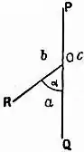 Fig. 3.The three angles between the tangent planes to the three surfaces of separation at the point are completely determined by the tensions of the three surfaces. For if in the triangle the side is taken so as to represent on a given scale the tension of the surface of contact of the fluids and , and if the other sides and are taken so as to represent on the same scale the tensions of the surfaces between and and between and respectively, then the condition of equilibrium at for the corresponding tensions , and is that the angle shall be the supplement of , of , and, therefore, of . Thus the angles at which the surfaces of separation meet are the same at all parts of the line of concourse of the three fluids. When three films of the same liquid meet, their tensions are equal, and, therefore, they make angles of 120° with each other. The froth of soap-suds or beaten-up eggs consists of a multitude of small films which meet each other at angles of 120°.