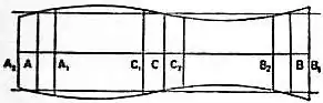 Fig. 13.Let one of these disks be made to approach the other by a small quantity . The film will swell out into the convex part of an unduloid, having its largest section midway between the disks, and we have to determine whether the internal pressure will be greater or less than before. If and (fig. 13) are the disks, and if the distance between the disks is equal to half the wave-length of the harmonic curve, the disks will be at the points where the curve is at its mean distance from the axis, and the pressure will therefore be as before. If , are the disks, so that the distance between them is less than , the curve must be produced beyond the disks before it is at its mean distance from the axis. Hence in this case the mean distance is less than , and the pressure will be greater than . If, on the other hand, the disks are at and , so that the distance between them is greater than , the curve will reach its mean distance from the axis before it reaches the disks. The mean distance will therefore be greater than , and the pressure will be less than . Hence if one of the disks be made to approach the other, the internal pressure will be increased if the distance between the disks is less than half the circumference of either, and the pressure will be diminished if the distance is greater than this quantity. In the same way we may show that if the distance between the disks is increased, the pressure will be diminished or increased according as the distance is less or more than half the circumference of either.