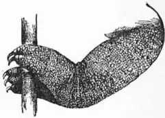 o’shaughenesii, outer view.Madagascar. The commonest species in the trade is Ch. vulgaris of North Africa, introduced into southern Andalusia. A few queer genera, with much stunted tail, e.g. Rhampholeon, in tropical Africa and Brookesia in Madagascar are the most aberrant. The common chameleon is the most typical. The head is raised into a pyramidal crest far beyond the occiput, there is no outer ear, nor a drum-cavity. The limbs are very long and slender, and the digits form stout grasping bundles; on the hand the first three form an inner bundle, opposed to the remaining two; on the foot the inner bundle is formed by the first and second toe, the outer by the other three toes. The tail is prehensile, by being rolled downwards; it is not brittle and cannot be renewed. The eyeballs are large, but the lids are united into one concentric fold, leaving only the small pupil visible. The right and left eyes are incessantly moved separately from each other and literally in every direction, up and down, forwards and straight backwards, producing the most terrible squinting. Chameleons alone of all reptiles can focus their eyes upon one spot, and conformably they alone possess a retinal macula centralis, or spot of acutest, binocular vision. The tongue has attained an extraordinary development. It is club-shaped, covered with a sticky secretion, and based upon a very narrow root, which is composed of extremely elastic fibres and telescoped over the much elongated, style-shaped, copular piece of the hyoid. The whole apparatus is kept in a contracted state like a spring in a tube. When the spring is released, so to speak, by filling the apparatus with blood and by the play of the hyoid muscles, the heavy thick end shoots out upon the insect prey and is withdrawn by its own elasticity.