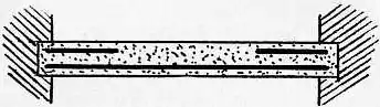 But it is in the design of steel concrete beams that the greatest ingenuity has been shown, and almost every patentee of a “system” has some new device for arranging the steel reinforcement to the best advantage. Concrete by itself, though strong in compression, can offer but little resistance to tensile and shearing stresses, and as these stresses always occur in beams the problem arises how best to arrange the steel so as to assist the concrete in bearing them. To meet tensile stresses the steel is nearly always inserted in the form of bars running along the beam. Figs. 6 to 9 show how they are arranged for different loading. In each case the object is to place the bars as nearly as possible where the tensile stresses occur. In cases where all the stresses are heavy, that portion of the beam which is under compression is similarly reinforced, though with smaller bars (figs. 10 and 11). But as these tension and compression bars are generally placed near the under and upper surface of the beam they are of little use in helping to resist the shearing stresses which are greatest at its neutral axis. (See Bridges.) These shearing stresses in a heavily loaded beam would cause it to split horizontally at or near the centre. To prevent this many ingenious devices have been introduced. (1) Perhaps one of the most efficient is a diagonal bracing of steel wire passing to and fro between the upper and lower bars and firmly secured to each by lapping or otherwise (fig. 12); this device is used in the Coignet and other French systems. (2) In the Hennebique system (which has found great favour in England) vertical bands or “stirrups,” as they are generally called, of hoop steel are used (fig. 13). They are of U shape, and passing round the tension bars extend to the top of the beam (figs. 14 and 3). They are exceedingly thin, but being buried in concrete no danger of their perishing from rust is to be feared. (3) In the Boussiron system a similar stirrup is used, but instead of being vertical the two parts are spread so that each is slightly inclined. (4) In the Coularon system, the stirrups are inclined as in fig. 15, and consist of rods, the ends of which are hooked over the tension and compression bars. (5) In the Kahn system the stirrups are similarly arranged, but instead of being merely secured to the tension bar, they form an integral part of it like branches on a stem, the bar being rolled to a special section to admit of this. (6) In many systems such as the “expanded metal” system, the tension and compression rods together with the stirrups are all abandoned in favour of a single rolled steel joist of I section, buried in concrete (see fig. 16). Probably the weight of steel used in this way is excessive, but the joists are cheap, readily procurable and easy to handle.