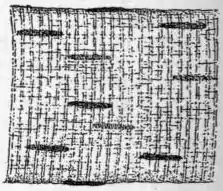 | Fig. 11.—Striated or Voluntary muscle Fibre, with alternate light and dark bands and many nuclei immediately beneath the sarcolemma. |