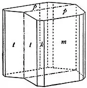 Distinctly developed crystals with terminal planes are rare, the mineral being commonly found as lamellar cleavage masses or long blade-shaped crystals embedded in crystalline rocks. The colour is usually a pale sky-blue, but may be white, greenish or yellowish; it varies in intensity in different bands, so that the crystals usually present a more or less striped appearance. There is a perfect cleavage parallel to the broad face m (100), and a less perfect one parallel to t (010): the basal plane p (001), oblique to the prism zone, is a gliding plane on which secondary twinning is produced by pressure, giving rise to characteristic horizontal striations on the cleavage face m. The accompanying figure represents a crystal twinned on the plane m (100). A negative biaxial optic figure is seen in convergent polarized light through the cleavage plane m, the axial plane being inclined at about 30° to the edge between m and t. A remarkable feature of cyanite is the great difference in hardness on different faces of the same crystal and in different directions on the same face: on the face m in a direction parallel to the edge between m and p the hardness is 7, whilst in a direction parallel to the edge between m and t it is 4½. The name disthène, from δίς, two, and σθένος, strong, has reference to these differences in hardness.