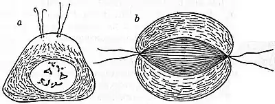 Fig. 3.—Spermatocytes of Bombyx mori, showing the precocious appearance of the spermatozoon flagellum and its relation to the centrosome. (After Henneguy.)