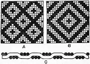 In its textile use, the term diaper was originally applied to silk patterns of a geometrical pattern; it is now almost exclusively used for diamond patterns made from linen or cotton yarns. An illustration of two patterns of this nature is shown in the figure. The floats of the warp and the weft are mostly in three; indeed the patterns are made from a base weave which is composed entirely of floats of this number. It will be seen that both designs are formed of what may be termed concentric figures—alternately black and white. Pattern B differs from pattern A only in that more of these concentric figures are used for the complete figure. If pattern B, which shows only one unit, were extended, the effect would be similar to A, except for the size of the unit. In A there are four complete units, and hence the pattern appears more striking. Again, the repeating of B would cause the four corner pieces to join and to form a diamond similar to the one in the centre. The two diamonds in B would then alternate diagonally to left and right. Special names are given to certain kinds of diapers, e.g. “bird’s-eye,” “pheasant’s-eye”; these terms indicate, to a certain extent, the size of the complete diamond in the cloth—the smaller kind taking the name “bird’s-eye.” The size of the pattern on paper has little connexion with the size of the pattern in the cloth, for it is clearly the number of threads and picks per inch which determine the size of the pattern in the cloth from any given design. Although A is larger than what is usually termed the “bird’s-eye” pattern, it is evident that it may be made to appear as such, provided that the cloth is fine enough. These designs, although adapted mostly for cloths such as nursery-diapers, for pinafores, &c., are sometimes used in the production of towels and table-cloths. In the figure, the first pick in A is identical with the first pick in B, and the part C shows how each interweaves with the twenty-four threads.