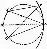 where v1 = AQ′, u = AQ, a = OA, φ = angle of incidence QAO, equal to the angle of reflection Q′AO. If Q be on the circle described upon OA as diameter, so that u = a cos φ, then Q′ lies also upon the same circle; and in this case it follows from the symmetry that the unsymmetrical aberration (depending upon α) vanishes.