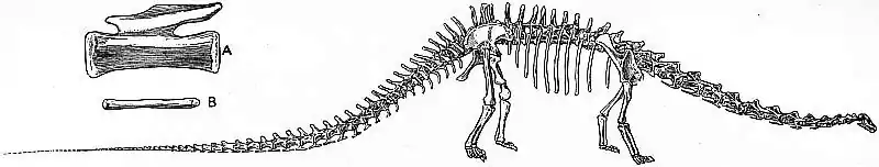 | Reconstructed Skeleton of Diplodocus carnegii, Hatcher, about one-hundredth natural size. A and B, Caudal Vertebrae Nos. 36 and 70 of the same are about one-quarter natural size. |