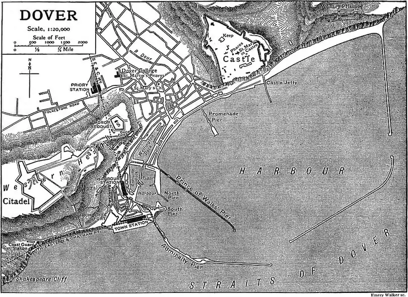 DOVER, a city and the county seat of Strafford county, New Hampshire, U.S.A., on the Cochecho river, at the head of navigation, 10 m. N.W. of Portsmouth. Pop. (1890) 12,790; (1900) 13,207, of whom 3298 were foreign-born; (1910 census) 13,247. Land area, 26·4 sq m. It is at the intersection of two branches of the Boston & Maine railway, and is served by several interurban electric lines. The street plan is irregular. Dover has a fine city hall of red brick and freestone; a public library containing (1907) 34,000 volumes, the Wentworth hospital; the Wentworth home for the aged, a children’s and an orphans’ home. The Strafford Savings Bank is said to be the largest and oldest savings institution in the state. Dover has long had a considerable commerce, both by rail and by water, that by water being chiefly in coal and building materials. The navigation of the Cochecho river has been greatly improved by the Federal government, at a cost between 1829 and 1907 of about $300,000, and in 1909 there was a navigable channel, 60-75 ft. wide and 7 ft. deep at mean low water, from Dover to the mouth of the river; the mean range of tides is 6·8 ft. The Cochecho river falls 3112 ft. within the city limits and furnishes water-power for factories; among the manufactures are textiles, boots and shoes, leather belting, sash, doors and blinds, carriages, machinery and bricks. In 1905 Dover ranked fourth among the manufacturing cities of the state, and first in manufactures of woollens; the value of the city’s total factory product in that year was $6,042,901. Dover is one of the two oldest cities in the state. In May 1623 a settlement was established by Edward Hilton on Dover Point, about 5 m. S.E. of the Cochecho Falls; the present name was adopted in 1639, and with the development of manufacturing and trading interests the population gradually removed nearer the falls; Hilton and his followers were Anglicans, but in 1633 they were joined by several Puritan families under Captain Thomas Wiggin, who settled on Dover Neck (1 m. above Dover Point), which for 100 years was the business centre of the town. As the settlement was outside the jurisdiction of any province, and as trouble arose between the two sects, a plantation covenant was drawn up and signed in 1640 by forty-one of the inhabitants. Dissensions, however, continued, and in 1641, by the will of the majority, Dover passed under the jurisdiction of Massachusetts and so remained for nearly half a century. The town, between 1675 and 1725, suffered greatly from Indian attacks, particularly from that of the 28th of June 1689 at Cochecho Falls. Dover was first chartered as a city in 1855. Within the original territory of the town were included Newington, set off in 1713, Somersworth (1729), Durham (1732), Medbury (1755), Lee, set off from Durham in 1766, and Rollinsford, set off from Somersworth in 1849.