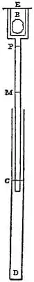 The methods for determining densities may be divided into two groups according as hydrostatic principles are employed or not. In the group where the principles of hydrostatics are not employed the method consists in determining the weight and volume of a certain quantity of the substance, or the weights of equal volumes of the substance and of the standard. In the case of solids we may determine the volume in some cases by direct measurement—this gives at the best a very rough and ready value; a better method is to immerse the body in a fluid (in which it must sink and be insoluble) contained in a graduated glass, and to deduce its volume from the height to which the liquid rises. The weight may be directly determined by the balance. The ratio “weight to volume” is the absolute density. The separate determination of the volume and mass of such substances as gunpowder, cotton-wool, soluble substances, &c., supplies the only means of determining their densities. The stereometer of Say, which was greatly improved by Regnault and further modified by Kopp, permits an accurate determination of the volume of a given mass of any such substance. In its simplest form the instrument consists of a glass tube PC (fig. 1), of uniform bore, terminating in a cup PE, the mouth of which can be rendered airtight by the plate of glass E. The substance whose volume is to be determined is placed in the cup PE, and the tube PC is immersed in the vessel of mercury D, until the mercury reaches the mark P. The plate E is then placed on the cup, and the tube PC raised until the surface of the mercury in the tube stands at M, that in the vessel D being at C, and the height MC is measured. Let k denote this height, and let PM be denoted by l. Let u represent the volume of air in the cup before the body was inserted, v the volume of the body, a the area of the horizontal section of the tube PC, and h the height of the mercurial barometer. Then, by Boyle’s law (u − v + al)(h − k) = (u − v)h, and therefore v = u − al(h − k)/k.