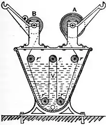 Fig. 3.—Dye-jigger.most common use for the first method is the Lancashire “jigger,” which is simple in principle and is shown in section in fig. 3. It consists essentially of a dye-vessel constructed of wood or cast iron and containing loose guide rollers, r and r, at the top and bottom. By coupling up the roller B with the driving gear the pieces which are batched on A are drawn through the dye liquor and rolled on to B. A band brake (not shown in the figure) applied to the axis of A gives the pieces the required amount of tension in passing through the dye-bath. As soon as the whole of the pieces have passed through in this way from A to B, the machine is reversed, and roller A draws them back again through the bath in a similar way on to roller A. This alternating process goes on until the dyeing is finished, when the goods are washed off, squeezed and dried. The jigger is especially useful in cotton piece dyeing, one great advantage being that it is suited for what is known as a “short bath,” i.e. a bath containing a minimum amount of dye liquor, this being of great importance in the application of dyestuffs which do not exhaust well, like the direct colours and the sulphide colours. The padding machine is similar in principle to the jigger, the pieces running over loose guide rollers through the mordant or dye solution contained in a trough of suitable shape and size, but on leaving the machine they pass through a pair of squeezing rollers which uniformly express the excess of liquor and cause it to be returned to the bath. The padding machine is used more for preparing (mordanting, &c.) than for dyeing.