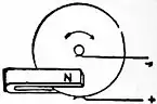 Fig. 1.set up in a coil of wire during its movement across the poles of a magnet led naturally to the explanation of induced electromotive force as caused by the linking or unlinking of magnetic lines of flux with an electric circuit. For the more definite case of the dynamo, however, we may, with Faraday, make the transition from line-linkage to the equivalent conception of “line-cutting” as the source of E.M.F.—in other words, to the idea of electric conductors “cutting” or intersecting[1] the lines of flux in virtue of relative motion of the magnetic field and electric circuit. On the 28th of October 1831 Faraday mounted a copper disk so that it could be rotated edgewise between the poles of a permanent horse-shoe magnet. When so rotated, it cut the lines of flux which passed transversely through its lower half, and by means of two rubbing contacts, one on its periphery and the other on its spindle, the circuit was closed through a galvanometer, which indicated the passage of a continuous current so long as the disk was rotated (fig. 1). Thus by the invention of the first dynamo Faraday proved his idea that the E.M.F. induced through the interaction of a magnetic field and an electric circuit was due to the passage of a portion of the electric circuit across the lines of flux, or vice versa, and so could be maintained if the cutting of the lines were made continuous.[2] In comparison with Faraday’s results, the subsequent advance is to be regarded as a progressive perfecting of the mechanical and electro-magnetic design, partly from the theoretical and partly from the practical side, rather than as modifying or adding to the idea which was originally present in his mind, and of which he already saw the possibilities.