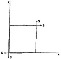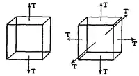 Fig. 17. A state of stress in which the traction across any plane of a set of parallel planes is normal to the plane, and that across any perpendicular plane vanishes, is described as a state of “simple tension” (“simple pressure” if the traction is negative). A state of stress in which the traction across any plane is normal to the plane, and the traction is the same for all planes passing through any point, is described as a state of “uniform tension” (“uniform pressure” if the traction is negative). Sometimes the phrases “isotropic tension” and “hydrostatic pressure” are used instead of “uniform” tension or pressure. The distinction between the two states, simple tension and uniform tension, is illustrated in fig. 1.