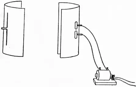 To illustrate the analogy between electric waves and waves of light Hertz found another form of apparatus more convenient. The vibrator consisted of two equal brass cylinders, 12 cm. long and 3 cm. in diameter, placed with their axes coincident, and in the focal line of a large zinc parabolic mirror about 2 m. high, with a focal length of 12.5 cm. The ends of the cylinders nearest each other, between which the sparks passed, were carefully polished. The detector, which was placed in the focal line of an equal parabolic mirror, consisted of two lengths of wire, each having a straight piece about 50 cm. long and a curved piece about 15 cm. long bent round at right angles so as to pass through the back of the mirror. The ends which came through the mirror were connected with a spark micrometer, the sparks being observed from behind the mirror. The mirrors are shown, in fig. 3.