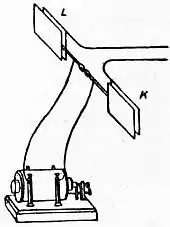 § 5. Stationary Electrical Vibrations.—Hertz (Wied. Ann. 34, p. 609) made his experiments on these in a large room about 15 m. long. The vibrator, which was of the type first described, was placed at one end of the room, its plates being parallel to the wall, at the other end a piece of sheet zinc about 4 m. by 2 m. was placed vertically against the wall. The detector—the circular ring previously described—was held so that its plane was parallel to the metal plates of the vibrator, its centre on the line at right angles to the metal plate bisecting at right angles the spark gap of the vibrator, and with the spark gap of the detector parallel to that of the vibrator. The following effects were observed when the detector was moved about. When it was close up to the zinc plate there were no sparks, but they began to pass feebly as soon as it was moved forward a little way from the plate, and increased rapidly in brightness until it was about 1.8 m. from the plate, when they attained their maximum. When its distance was still further increased they diminished in brightness, and vanished again at a distance of about 4 m. from the plate. When the distance was still further increased they reappeared, attained another maximum, and so on. They thus exhibited a remarkable periodicity similar to that which occurs when stationary vibrations are produced by the interference of direct waves with those reflected from a surface placed at right angles to the direction of propagation. Similar periodic alterations in the spark were observed by Hertz when the waves, instead of passing freely through the air and being reflected by a metal plate at the end of the room, were led along wires, as in the arrangement shown in fig. 4. L and K are metal plates placed parallel to the plates of the vibrator, long parallel wires being attached to act as guides to the waves which were reflected from the isolated end. (Hertz used only one