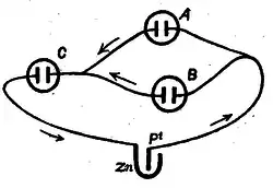 Fig. 1 Faraday’s Laws.—The first exact quantitative study of electrolytic phenomena was made about 1830 by Michael Faraday (Experimental Researches, 1833). When an electric current flows round a circuit, there is no accumulation of electricity anywhere in the circuit, hence the current strength is everywhere the same, and we may picture the current as analogous to the flow of an incompressible fluid. Acting on this view, Faraday set himself to examine the relation between the flow of electricity round the circuit and the amount of chemical decomposition. He passed the current driven by a voltaic battery ZnPt (fig. 1) through two branches containing the two electrolytic cells A and B. The reunited current was then led through another cell C, in which the strength of the current must be the sum of those in the arms A and B. Faraday found that the mass of substance liberated at the electrodes in the cell C was equal to the sum of the masses liberated in the cells A and B. He also found that, for the same current, the amount of chemical action was independent of the size of the electrodes and proportional to the time that the current flowed. Regarding the current as the passage of a certain amount of electricity per second, it will be seen that the results