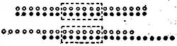 Fig. 2 The black circles represent one ion and the white circles the other. If the black ions move twice as fast as the white ones, the state of things after the passage of a current will be represented by the lower part of the figure. Here the middle part of the solution is unaltered and the number of ions liberated is the same at either end, but the amount of salt left at one end is less than that at the other. On the right, towards which the faster ion travels, five molecules of salt are left, being a loss of two from the original seven. On the left, towards which the slower ion moves, only three molecules remain—a loss of four. Thus, the ratio of the losses at the two ends is two to one—the same as the ratio of the assumed ionic velocities. It should be noted, however, that another cause would be competent to explain the unequal dilution of the two solutions. If either ion carried with it some of the unaltered salt or some of the solvent, concentration or dilution of the liquid would be produced where the ion was liberated. There is reason to believe that in certain cases such complex ions do exist, and interfere with the results of the differing ionic velocities.
