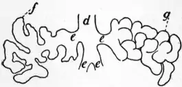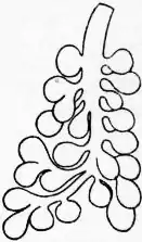 | Fig. 10.—A Tubulo-alveolar Gland. One of the mucous salivary glands of the dog. On the left the alveoli are unfolded to show their general arrangement. d, Small duct of gland subdividing into branches; e, f and g, terminal tubular alveoli of gland. | Fig. 11.—A Compound Alveolar Gland. One of the terminal lobules of the pancreas, showing the spherical form of the alveoli. |