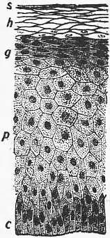 | c, Columnar cells resting on the fibrous true skin. p, The so-called prickle cells. g, Stratum granulosum. h, Horny cells. s, Squamous horny cells. |