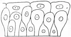 2. Stratified Ciliated Epithelium.—In this variety the superficial cells are ciliated and columnar, between the bases of these are found fusiform cells and the lowest cells are cubical or pyramidal. This epithelium is found lining parts of the respiratory passages, the vas deferens and the epididymis.