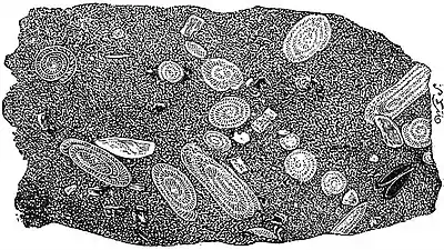 The pelagic floating genera are also specially modified. Their shell is either thin or extended many times by long slender tapering spines, and the protoplasm outside has the same character as that of the Radiolaria (q.v.), being differentiated into jelly containing enormous vacuoles and traversed by reticulate strands of granular protoplasm. These coalesce into a peripheral zone from which protrude the pseudopods, here rather radiate than reticulate. Most genera and most species are cosmopolitan; but local differences are often marked. Foraminifera abound in the shore sands and the crevices of coral reefs. The membranous shelled forms decay without leaving traces. The sandy or calcareous shells of dead Foraminifera constitute a large proportion of littoral sand, both below and above tide marks; and, as shown in the boring on Funafuti, enter largely into the constituents of coral rock. They may accumulate in the mud of the bottom to constitute Foraminiferal ooze. The source of these shells in the latter case is double: (1) shells of bottom-dwellers accumulate on the spot; (2) shells of dead plankton forms sink down in a continuous shower, to form a layer at the bottom of the ocean, during which process the spines are dissolved by the sea-water. Thus is formed an ooze known as “Globigerina-ooze,” being formed largely of that genus and its ally Hastigerina; below 3000 fathoms even the tests themselves are dissolved. Casts of their bodies in glauconite (a green ferrous silicate, whose composition has not yet been accurately determined) are, however, frequently left. Glauconitic casts of perforate shells, notably Globigerina, have been found in Lower Cambrian (e.g. Hollybush Sandstone), and the shells themselves in Siberian limestones of that age. It is only when we pass into the Silurian Wenlock limestone that sandy shells make their appearance. Above this horizon Foraminifera are more abundant as constituents, partial or principal of calcareous rocks, the genus Endothyra being indeed almost confined to Carboniferous beds. The genus Fusulina (fig. 20) and Saccammina (fig. 19) give their names (from their respective abundance) to two limestones of the Carboniferous series. Porcellanous shells become abundant only from the Lias upwards. The glauconitic grains of the Greensand formations are chiefly foraminiferal casts. Chalk is well known to consist largely of foraminiferal shells, mostly vitreous, like the north Atlantic globigerina ooze. In the Maestricht chalk more littoral conditions prevailed, and we find such large-sized species as Orbitoides (vitreous) and Orbitolites (porcellanous; figs. 5, 6), &c. In the Eocene Tertiaries the Calcaire Grossier of the Paris basin is mainly composed of Miliolid forms. Nummulites occur in English beds and in the Paris basin; but the great beds of these, forming reef-like masses of limestone, occur farther south, extending from the Pyrenees through the southern and eastern Alps to Egypt, Sinai, and on to north India. The peculiar structure occurring in the Lower Laurentian limestone, as well as other limestones of Archean age described as a Nummulitaceous genus, “Eozoon,” by Carpenter and Dawson, and abundantly illustrated in the 9th edition of his encyclopaedia, is now universally regarded as of inorganic origin. “Looking