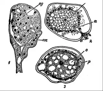 1, Peronospora parasitica. Young multinucleate oogonium (og) and antheridium (an). 2, Albugo candida. Oogonium with the central uninucleate oosphere and the fertilizing tube (a) of the antheridium which introduces the male nucleus. 3, The same. Fertilized egg-cell (o) surrounded by the periplasm (p). |